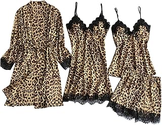 liqiuxiang パジャマ 上下セット レディース キャミソール セクシー ランジェリー パンツ 4点セット ナイトドレス レース ヒョウ柄 ルームウェア セットアップ ゆったり ナイトガウン